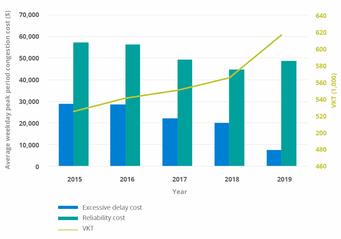 Part 1 of the study focused on an analysis of average weekday peak period congestion cost between 5am and 10am, when the managed motorway was operating. The congestion cost reductions identified on the Bruce Highway southbound between 2015 and 2019 are as follows: