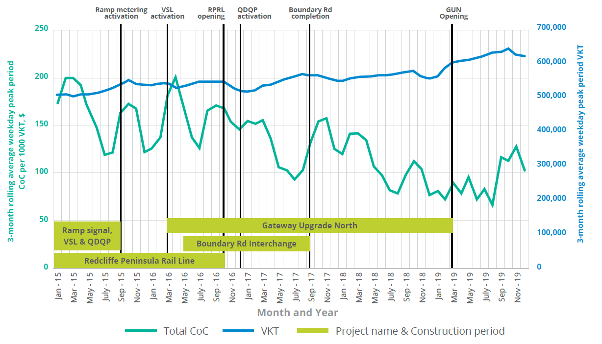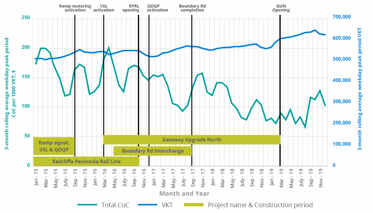 It was observed from the data that the ramp metering, VSL and QDQP systems were best utilised and performed best when all systems were activated. For example, the before-and-after comparison (2015 versus 2017), where all ramp metering, VSL and QDQP systems were activated, revealed significant congestion reduction on the Bruce Highway. While there was still ongoing traffic disruption from the GUN project, after-period data revealed a 21% reduction in normalised excessive delay cost and a 23% reduction in both normalised reliability cost and total cost. QDQP added significant benefits to the Bruce Highway congestion reduction.