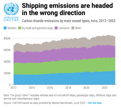International shipping plays a central role in global trade, carrying more than 80% of trade by volume (ie. more than 80% of the world merchandise trade by volume is transported by sea). However, shipping is also a significant source of greenhouse gas (GHG) emissions, accounting for around 3% of global emissions. And critically, emissions are increasing in this sector – for example, between 2020 and 2021, total emissions from the world fleet increased by 4.7% (UNCTAD 2022), with most of the increase coming from container vessels or the dry bulk and general cargo fleets. Alarmingly, the industry’s greenhouse gas emissions have increased by 20% over the last decade. Without action, emissions could reach 130% of their 2008 levels by 2050 (UNCTAD 2023).