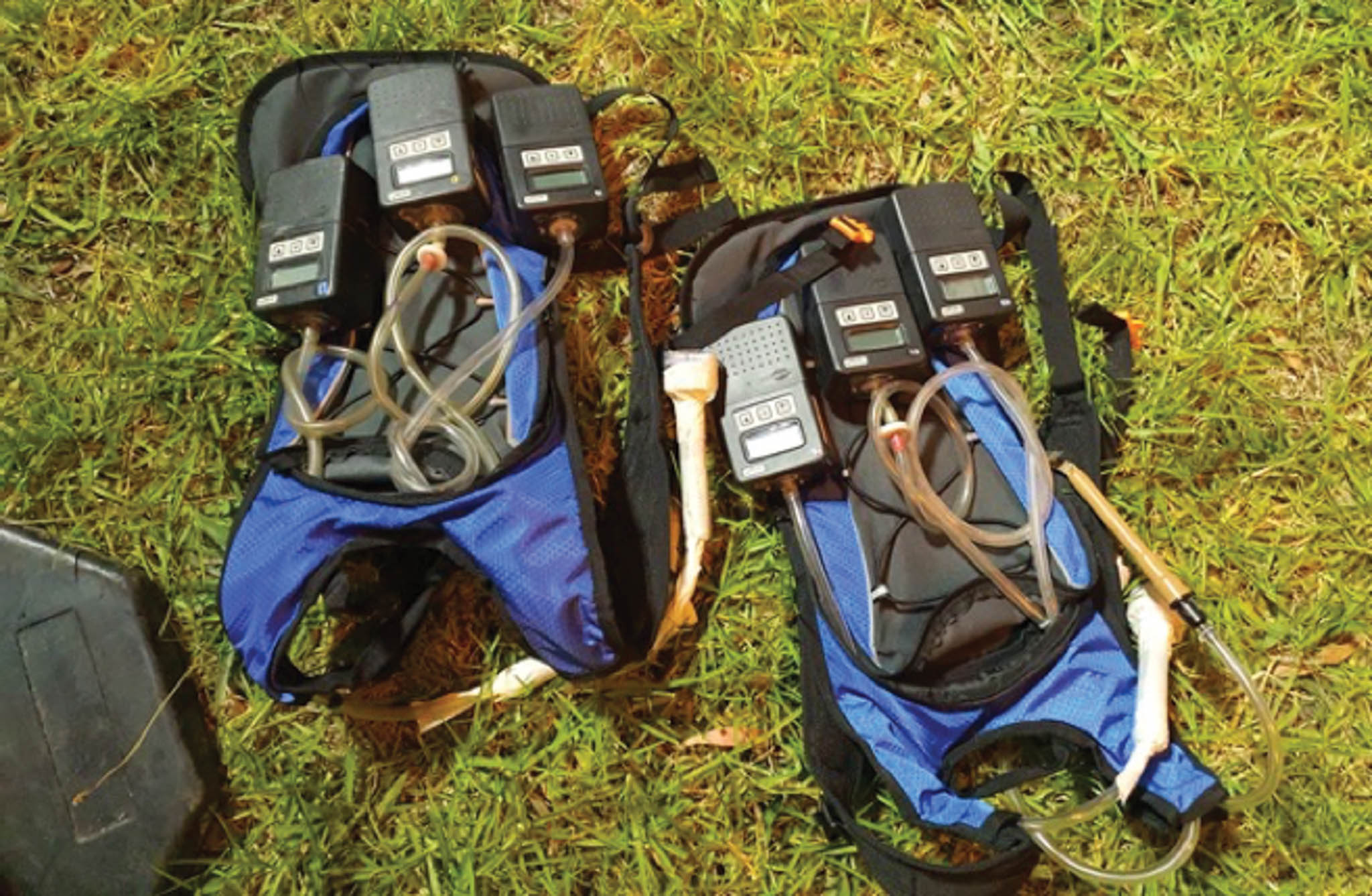 The monitoring devices were assembled into small backpacks worn for the extent of the paving operations by the nominated members of the paving crew (Figure 3). The devices collected samples for all the asphalts paved, both crumb rubber asphalts and control mixes, allowing comparison.