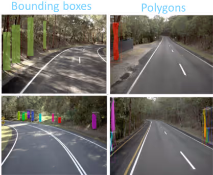 Training data was exported with the polygon coordinates and the final layer of the model was then trained on the small tree trunk dataset. Figure 5 shows tree trunk detection results when bounding boxes or polygons were used for data annotation. The result shows that the trunks' edge detection using polygons outperforms the bounding boxes, so the project progressed with polygon annotation.