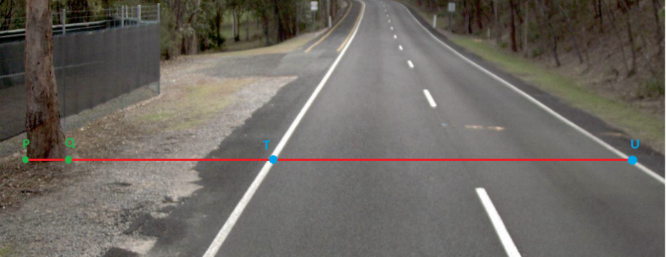 To estimate the distance of an object to the road, a pixel-distance ratio is used. As a typical road lane is 3.5 m, and the roads used as training inputs had two lanes, a driveable width of 7 m was assumed. Figure 8 shows points P and Q indicating the edges of the tree, and points T and U indicating the edges of the road. The difference in X-coordinate pixels was used to determine the distance of the tree, and its width, by calculating the pixel-driveable width ratio at that distance.