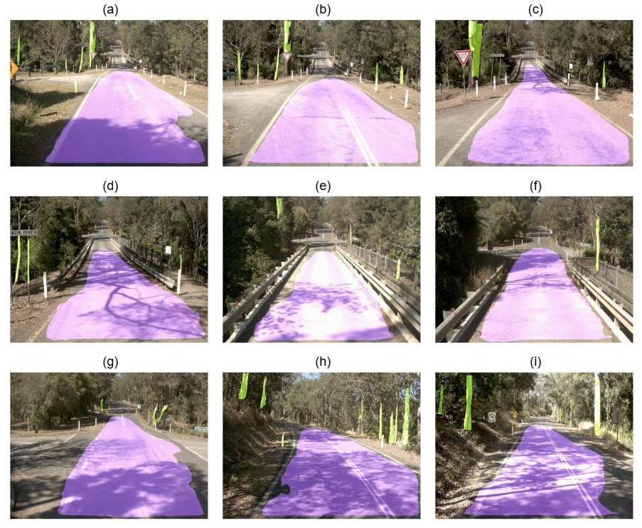 Figure 9 shows the qualitative results of the proposed detection model on sequential images of a test road. The result indicates a consistent detection from one frame to the next. It is also observable that signs, bars or pillars are sometimes detected as a tree trunk. These false detections do not pose significant issue for the proposed end-to-end model due to size, height and dimension. The manual annotation shows that TP= 89 and FP = 7 for the selected samples shows the 96% accuracy of tree trunk detection using Mask-RCNN.