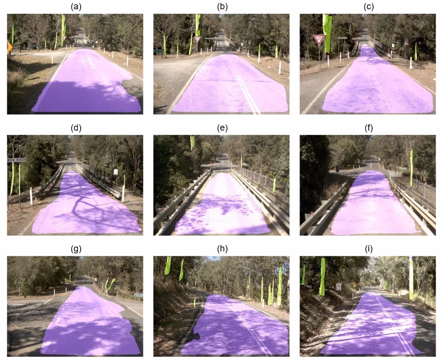 To overcome this, a small data set was labelled and used to train the available model based on polygons with outside road lines in the labelling. This allowed the model to identify the drivable path of the road without including the shoulder. This was theorised to have better precision in road width estimation, allowing the width of any given road segment to be assumed as 7 m, based upon an average 2-lane road. Figure 7 shows the successful road segmentation and tree trunk detection using the proposed model.