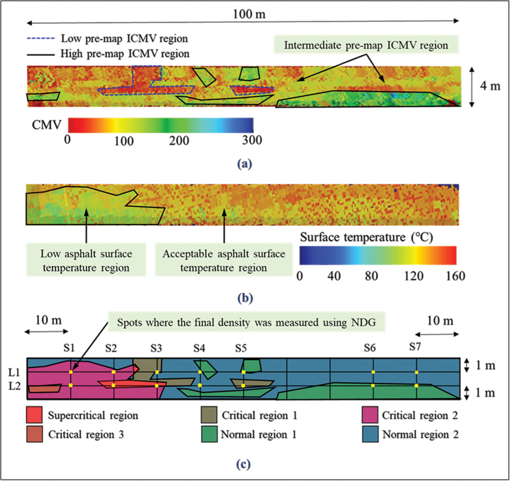 Weak underlying support may absorb a significant portion of the compaction effort during asphalt layer compaction, resulting in low densities in the asphalt layer. Moreover, areas with low surface temperatures demand particular attention, as asphalt workability decreases significantly with a reduced temperature (especially below the asphalt softening point). By superimposing the pre-mapping of ICMV (collecting ICMV data on the existing layer at lowered frequency and amplitude of vibration before paving the new asphalt layer) onto the asphalt surface temperature map produced in the final roller pass of the asphalt compaction, the pavement lot can be categorised into three regions. These are supercritical; critical; and normal (see Figure 4). Regions with low pre-map ICMV and low asphalt surface temperature are classified as 'supercritical', whereas those with either low pre-map ICMV or low asphalt surface temperature are 'critical'. The remainder of the pavement lot is considered in the 'normal' region. Spot tests for asphalt density should be performed in supercritical and critical regions.