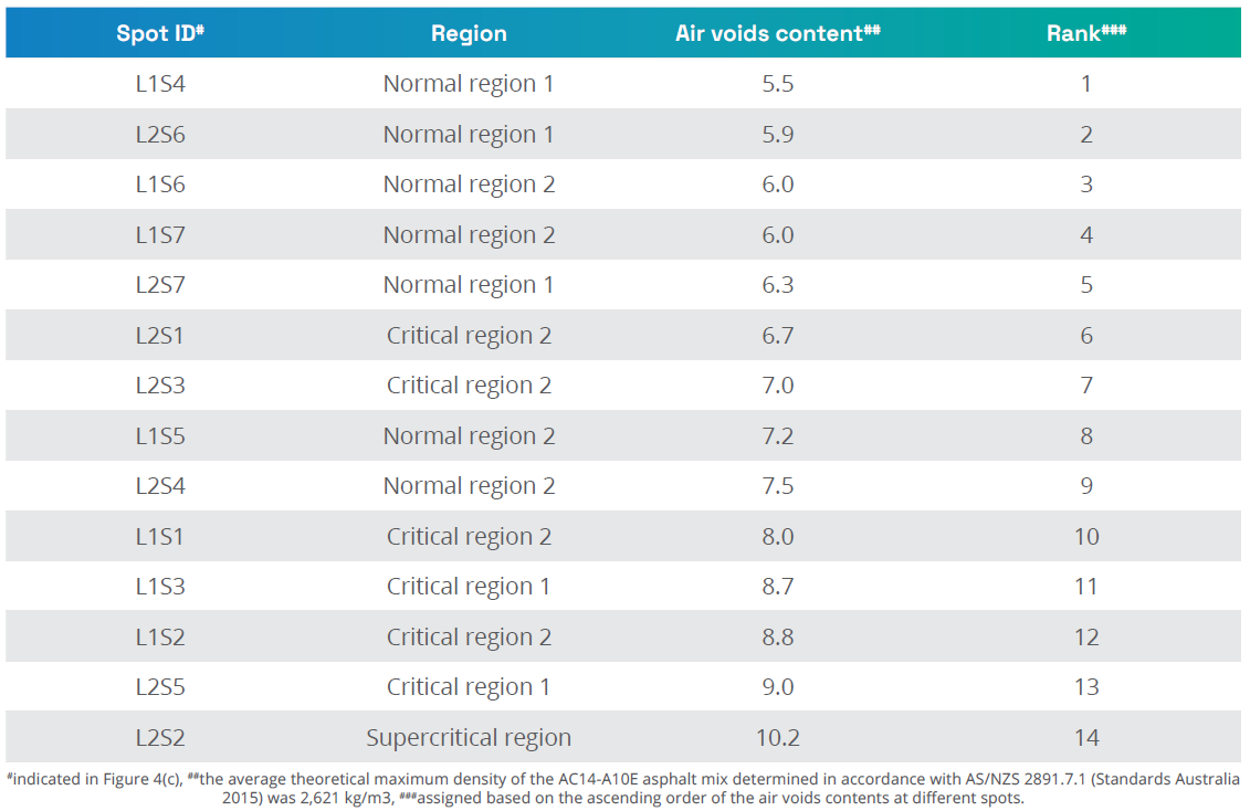 Table 1 indicates that the spot located in the supercritical region achieved the lowest level of compaction compared to the other spots. This could be attributed to weak underlying support and the low asphalt temperature during compaction. Despite spots L2S1 (rank 6) and L2S3 (rank 7) being assigned to critical region 2, and spots L1S5 (rank 8) and L2S4 (rank 9) being assigned to normal region 2, they exhibit a maximum difference of only 0.8% in their air void contents. As such, the approach demonstrates considerable promise.