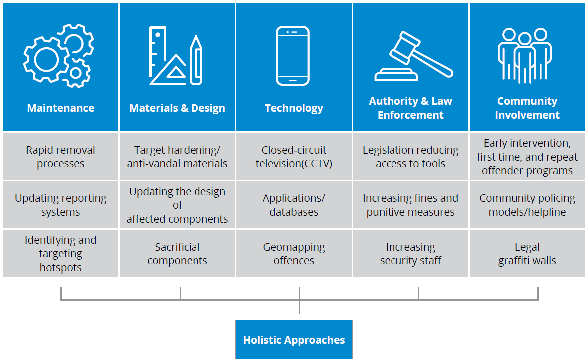 Upon review of prominent international and local cases relating to reducing vandalism, with a focus on rail environments, deterrence measures fell largely within six key areas: maintenance; materials and design; technology; authority and law enforcement; community involvement; and holistic approaches. The most common methods in each of these areas are detailed in Table 2 below. Approaches embedded in a holistic framework, partnered with a core understanding of underlying motivations and culture, yielded the most effective results. To be financially viable, these approaches also need to be tailored towards long-term results, rather than quick fixes.