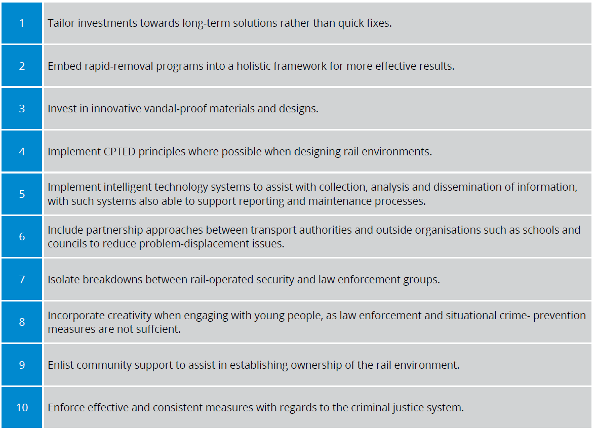 Beyond understanding the culture and motivations of vandalism, ten prominent strategic lessons emerged from the literature review. These should, where possible, be incorporated into future abatement programs and are detailed in Table 3 below.