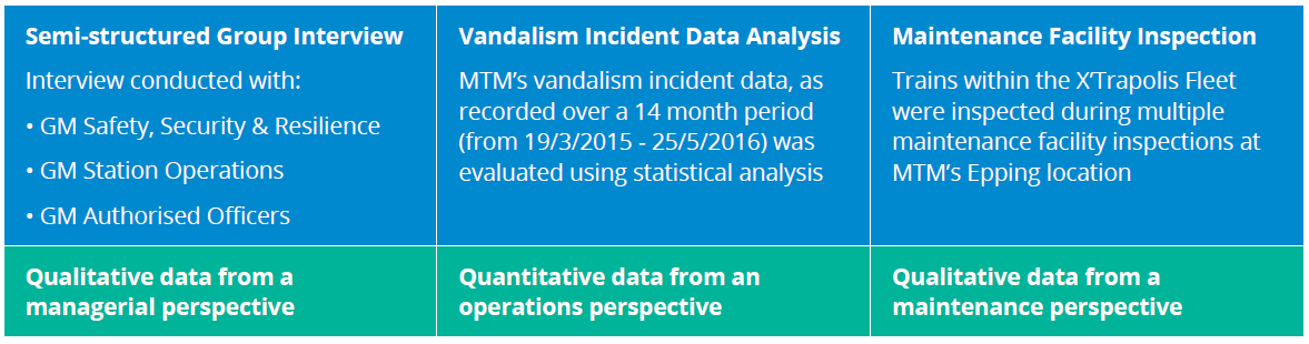 Identifying the rail asset at risk of causing the greatest operational impact (delays and/or cancellations) when vandalised was explored through both qualitative and quantitative research methods, as shown in Table 4.