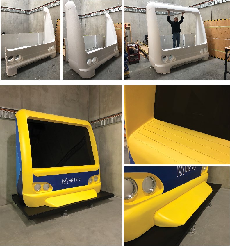 A six-axis CNC robot arm then fabricated the design interventions and exterior shell (the yellow fiberglass component attached to the front of the driver’s cabin) from expanded polystyrene (EPS), as shown in Figures 7 below. This 1:1 scale prototype meant the design interventions could be more fully realised, which assisted in evaluating their efficacy and communicating important details and features. Using 1:1 scale for the prototype also assisted in providing proof-of-concept, demonstrating the concepts’ feasibility and practical potential.