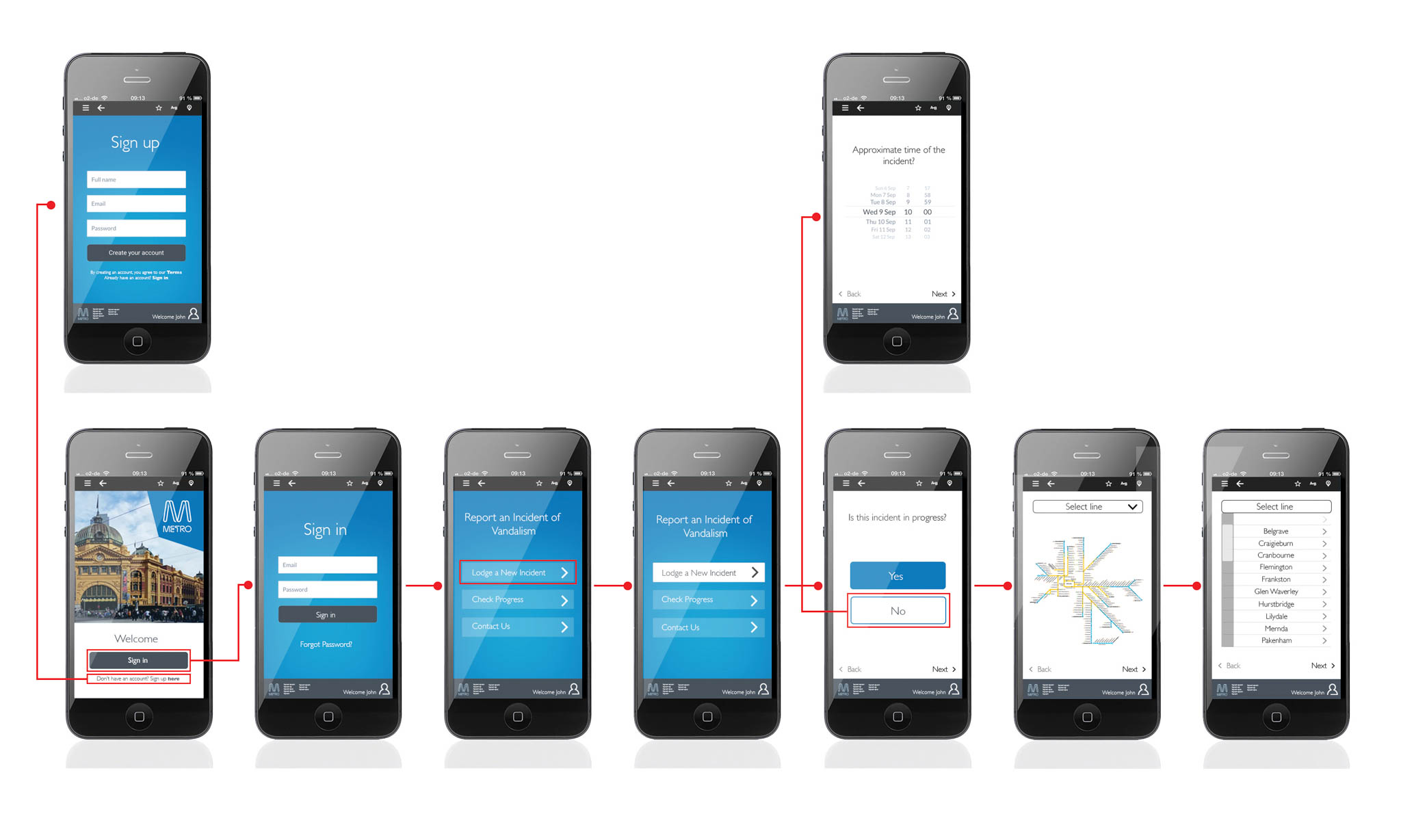 Lastly, to provide a holistic solution, a system-based intervention was developed, guided by the third design objective: involve the users through smart technology systems. This objective lent itself to the creation of a community reporting app, which the MTM semi-structured group interview had also encouraged. At present, the connection between users, mobile apps and assets appears limited within the context of public transport operations in Melbourne. Upon review, many apps within this space are centred around providing users with information to navigate the network and its services, rather than allowing active participation from an operations perspective.