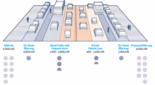 The concept of ride-sharing or Mobility as a Service (MaaS) maybe expanded to incorporate driverless vehicles, thus, the vehicle is better utilised compared to the current operational model, where a typical private vehicle may be unused 96.5% of the time-shared CAV operation model may reduce the number of vehicle up to 90% in a city centre environment. There are already several schools of thought on how to redesign street layout to facilitate the use of automated vehicle to increase road capacity. NACTO (2017) proposes a higher capacity road operation concept that relies on mass transit coupled with CAV operations for a more controlled environment to provide safety for pedestrians traffic (Figure 4).