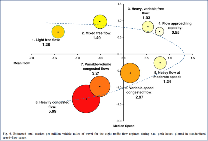 On motorways, with increasing traffic density and recurrent congestion, a shift away from run-off the road crashes towards rear-end crashes was observed over recent years. The increasing share of rear-end crashes can be linked to drivers being caught by surprise when approaching a congestion end (e.g. a ‘shockwave’ moving against the direction of travel) or minor stoppages created by vehicle clusters, called ‘nucleations’ in contemporary traffic flow theory (Kerner 2017). Golob et al. (2004), as well as Hovenden et al. (2020), have clearly shown that for local conditions, the crash risk is linked to the traffic state, i.e. it increases exponentially when transitioning from free flow to congestion (refer to Figure 2 – approximate speed-flow curve was added by the author as a dotted line).