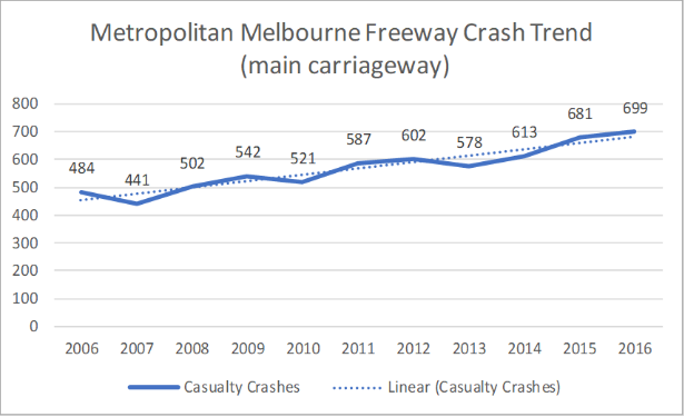 Motorways are the ‘heavy lifters’ of all transport infrastructure. For example, the Metropolitan Melbourne motorway network carries around 40% of urban arterial road travel as measured in Vehicle Kilometres Travelled (VKT), with an upward trend (VicRoads 2017). Crashes on this network comprise around 15% of urban Fatal and Serious Injury (FSI) crashes. Motorways generally show good safety performance in terms of a relatively low FSI crash rate compared to other road types. However, as motorways are partially taking over the role of other, congested arterial roads (i.e. accommodating more short trips), there is a disproportionate increase in VKT travelled on them and they are operated at or close to capacity (approaching congestion) more of the time when the highest number of vehicle conflicts occurs. For these two reasons, the absolute number of FSI crashes on urban motorways is increasing (Hovenden et al. 2020) and there is a pronounced rise in casualty crashes (refer to Figure 1).