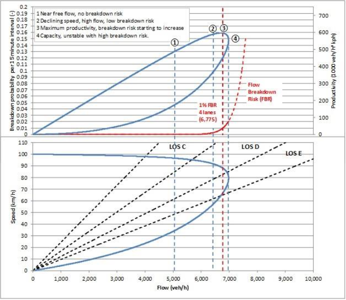 The optimal design capacity or Maximum Sustainable Flow Rate (MSFR), a new term used to reflect the HCM’s own capacity definition which requires the flow rate to be sustainable, is illustrated by the vertical red dotted line. In this case, the MCG has adopted the flow rate at 1% Flow Breakdown Risk (FBR) per 15-minute interval (or around 10% for a 3-hour peak period) as the Maximum Sustainable Flow Rate (MSFR). This coincides with the highest productivity (refer to Point 3 in Figure 3). This approach is reasonable to ensure good network reliability and productivity that is close to its maximum. In addition, the operation of the ALINEA/HERO based Coordinated Ramp Metering system in Victoria is based on operating the motorway at a 1% FBR per 15-minute interval.