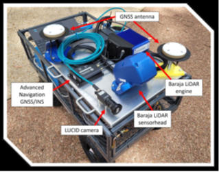 Figure 2 shows the sensing unit, which includes Advanced Navigation Spatial Dual GNSS/INS for global localisation, a Baraja Spectrum solid-state LiDAR for local localisation and a lucid global shutter camera for classification. While it could have been mounted on the trackside device developed in the first project, this advanced sensing unit was developed for potential use in a range of static and dynamic applications. As such, the unit was built into a trolley that could be moved by a person to map the local precinct.