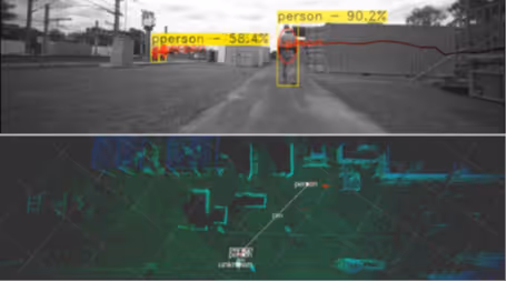 If the detected change was dynamic in nature (e.g. person), a tracking algorithm that predicts future movement based on past motion was implemented. This algorithm kept track of the movement of known objects and, if they moved out of view, provided an estimate on the rough location of the object within a world map. Figure 4 shows a visual overlay from the LUCID camera with tracked objects classified as people in the top frame. The bottom frame shows the tracking output that overlays the location of detected people on a map of the surrounding environment.
