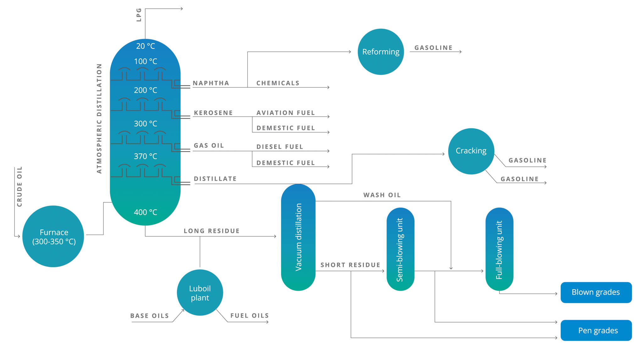 The produced bio-oil needs to further be treated to become a bio-binder suitable for road applications (Wang et al., 2020). Typically, crude oil is refined to produce usable components such as fuels and bitumen. The crude oil goes through a process called fractional distillation, involving an atmospheric and then a vacuum distillation step. Following the atmospheric distillation step, the long residue, comprising lubricating oil, paraffin wax and bitumen, remains in a liquid state. This is then further processed through vacuum distillation to produce distillates, gas oil and short residue. Bitumen is then manufactured from the short residue (Morgan and Mulder, 1995). The process is schematically illustrated in Figure 1.