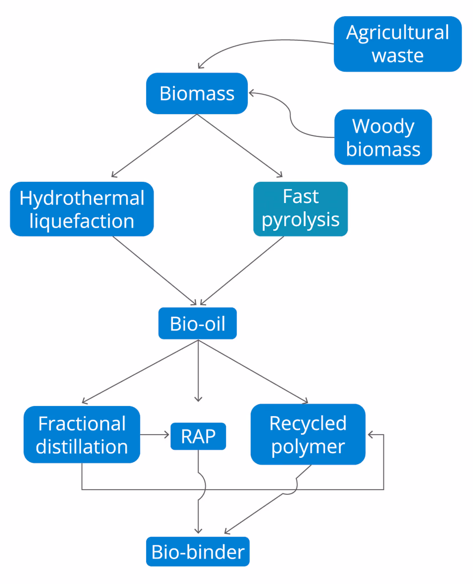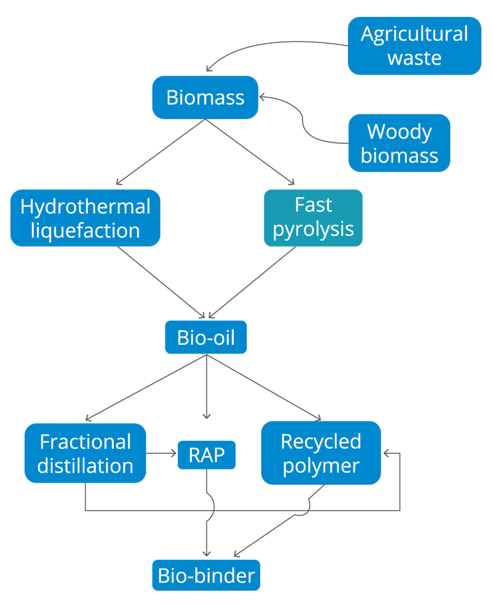 Biomass derives from plants and other organic waste and is used to generate fuels and/or energy (Wang et al., 2020). There are multiple sources of biomass, including wood and agricultural residues, as well as biowaste from households, farms and industry (ARRB, 2022). The great variability in biomass sources will understandably result in bio-oils and bio-binders with different chemical and, as a result, performance characteristics (Dong et al., 2019). It has been previously found that bio-binders produced from corn stover, switch grass and oak wood demonstrate properties similar to those of bituminous binders (Peralta et al., 2012).