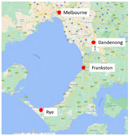 Rye is located towards the Southern end of the Mornington peninsula and is a popular destination for day trips from Melbourne’s Eastern and South Eastern Suburbs. It is roughly 100km from Melbourne’s CBD by road. Its location relative to nearby major centres is shown in Figure 1.