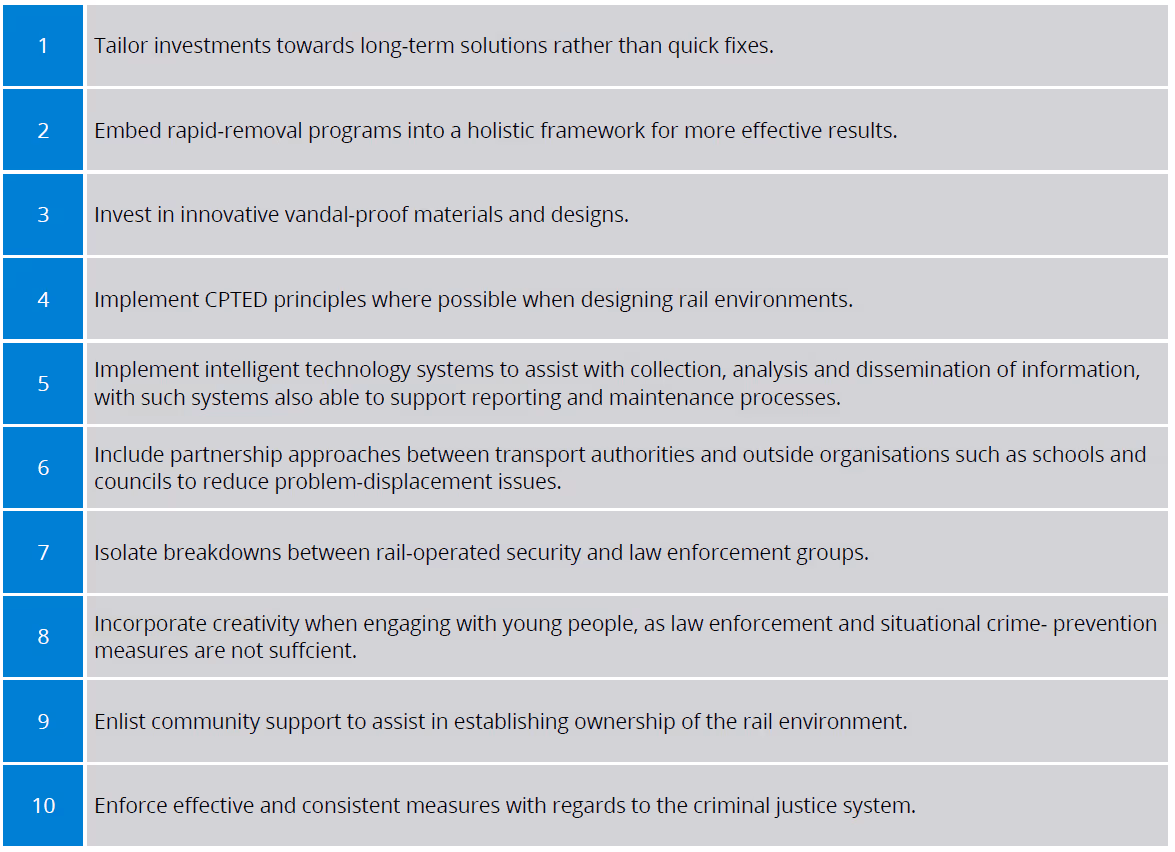 Beyond understanding the culture and motivations of vandalism, ten prominent strategic lessons emerged from the literature review. These should, where possible, be incorporated into future abatement programs and are detailed in Table 3 below.