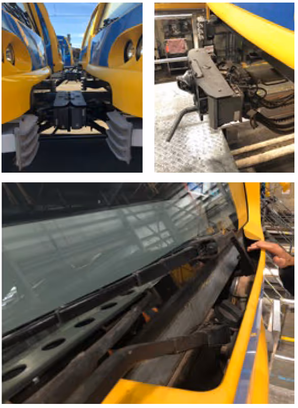 Upon identifying the windscreen as the at-risk asset, it was important to determine what makes it susceptible to vandalism. Observations from the semi-structured group interview and maintenance facility inspection noted that vulnerabilities in this area were largely linked to accessibility, materiality and surveillance. Of particular note was the rail coupler, which provides a flat, accessible surface to stand or crouch on, with the open cavity surrounding the windscreen wipers affording a secure level of grip, as shown in Figures 5.