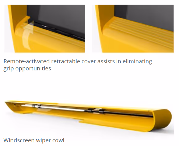 Two refined retrofit interventions emerged from the prototyping and evaluation processes. The first intervention, a protective coupler cowl, greatly reduces access to the windscreen. Its angled design was trialled through user testing (as shown in Figure 8 below), confirming its effectiveness in limiting balance when standing or crouching. Should vandals access the cowl, weight-detecting sensors alert both the vandal through a visual alarm, and operators through an incident-alert system. The second intervention, a protective, automated cowl, encloses the open cavity surrounding the windscreen wipers. This ensures that the windscreen wipers cannot be leveraged for grip, while also protecting them when not in use.