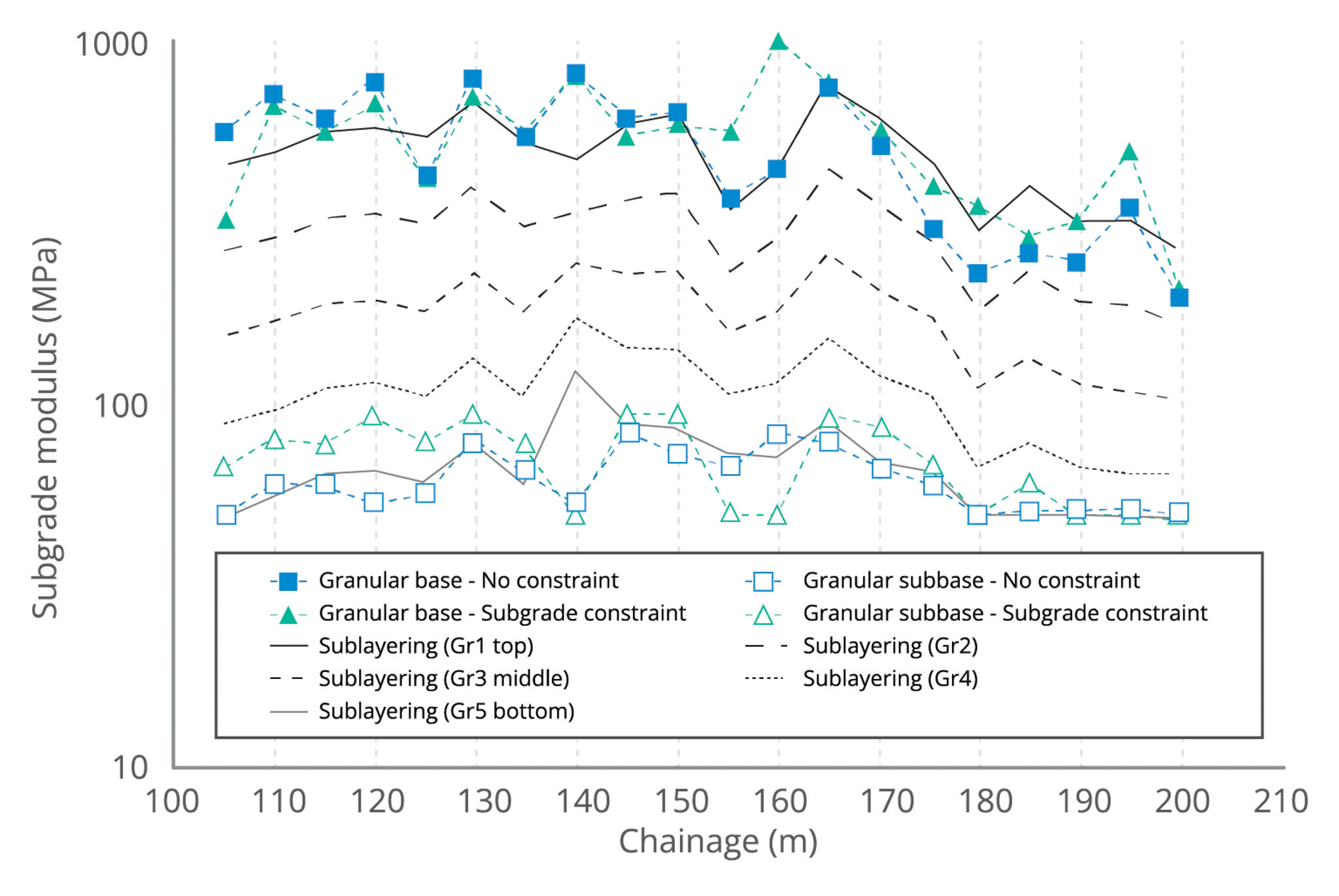 When the granular sublayering constraint was employed, the moduli of the granular sublayers (Gr1 to Gr5) were gradually decreasing from the top (Gr1) to the bottom (Gr5). In this case, Gr1 to Gr5 generally exhibited the moduli within a similar range to the ones from the base and subbase without the constraints (see Figure 2).