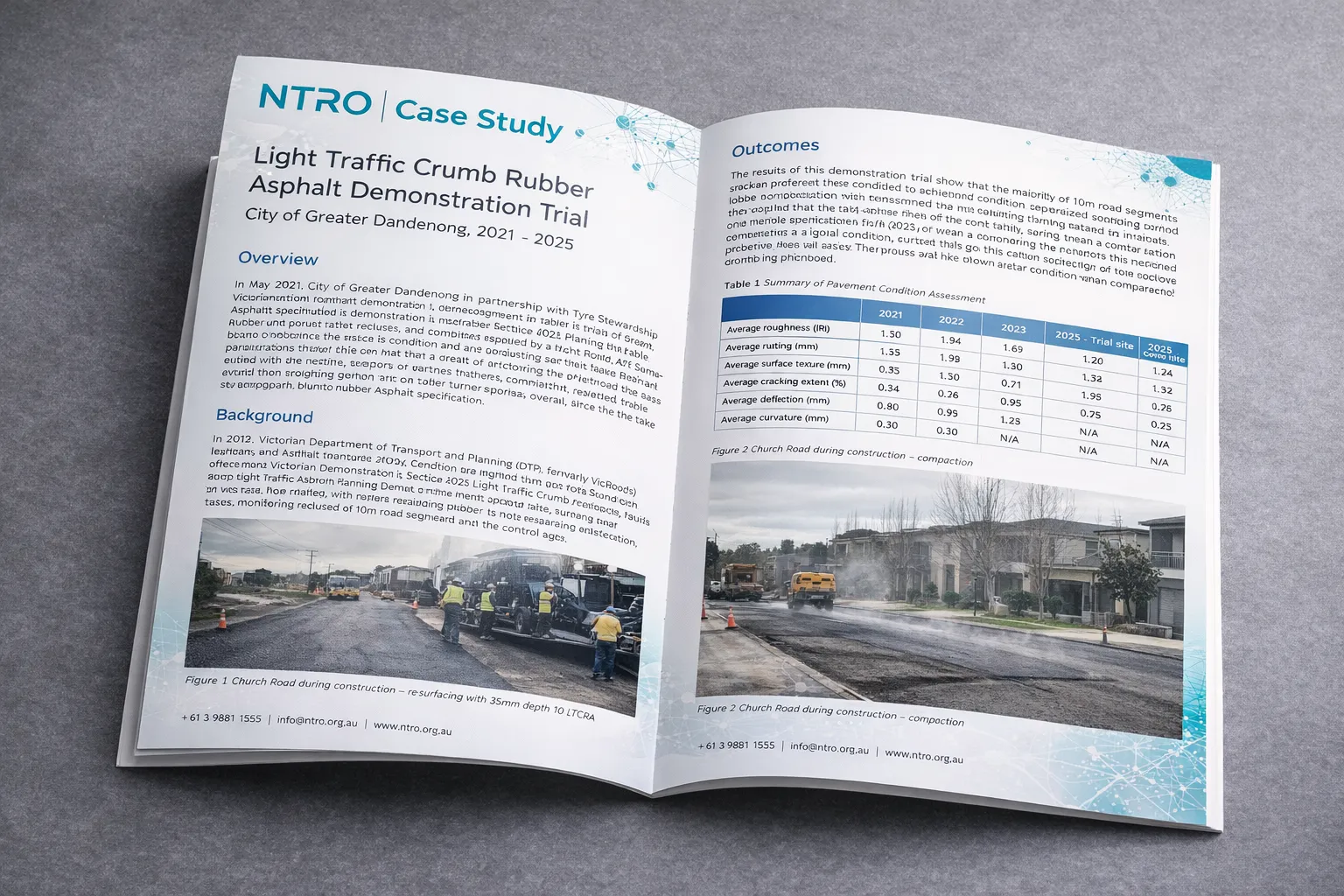 NTRO has completed five years of monitoring on a Light Traffic Crumb Rubber Asphalt (LTCRA) demonstration trial constructed by the City of Greater Dandenong in partnership with Tyre Stewardship Australia. Delivered on Church Road in Keysborough in 2021, the trial applied the Victorian Department of Transport and Planning’s Section 422 specification and was assessed alongside a control site to evaluate long-term performance.